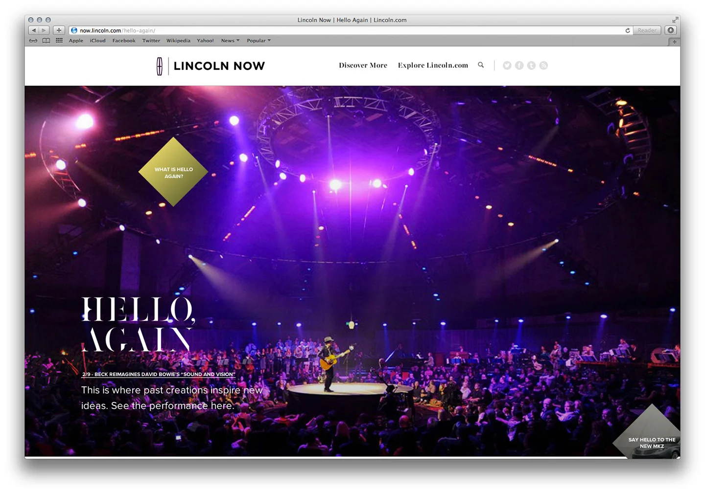A print and digital campaign of branded content featuring Beck and The Lincoln Motor Company. The campaign consisted of an interactive film in which Beck covered David Bowie's "Sound and Vision" on a concentric circular stage which could be viewed from multiple 360-degree cameras with binaural sound. The print campaign promoting the content featured a fold-out poster with portraits shot by renowned photographer, Peter Hapak.